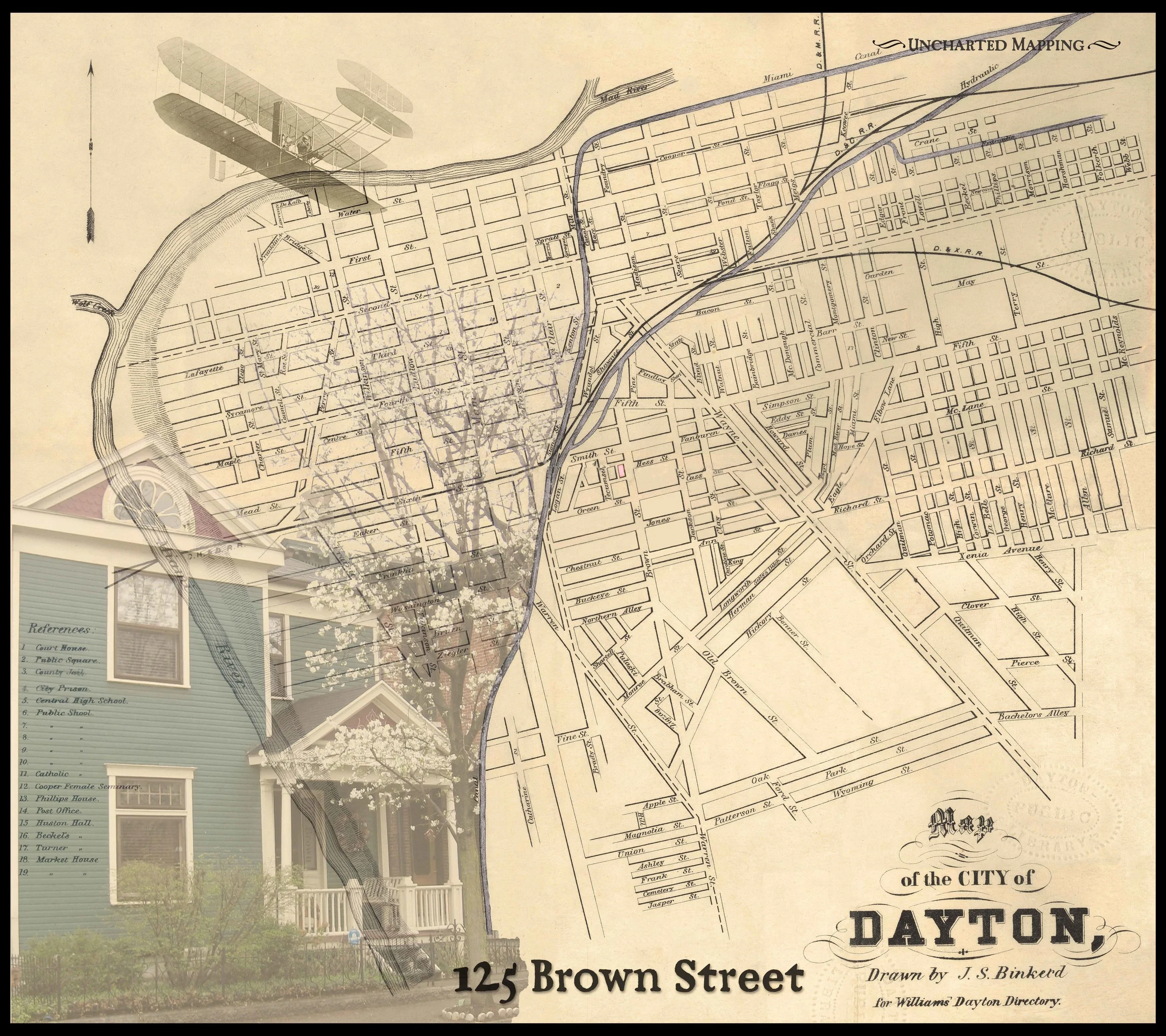 Court at Uncharted Mapping found us an old map of Dayton which we loved. Unfortunately, it was in very poor condition but Court did an amazing job restoring it to its former glory by removing all of the folds and tears. He then tastefully incorporated a picture of our 115-year old house into the map along with the iconic Wright Flyer. The framed piece hangs in our living room, and is frequently the subject of interested conversation with our family and neighbors. We love it!